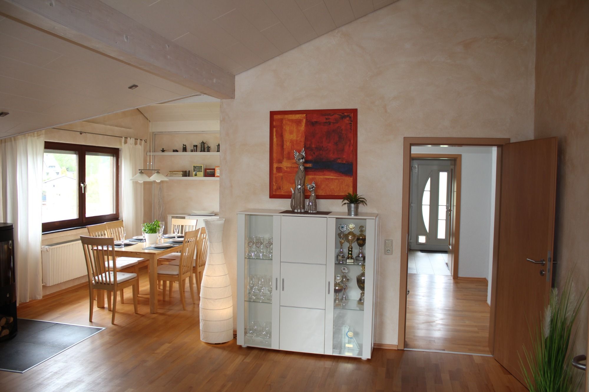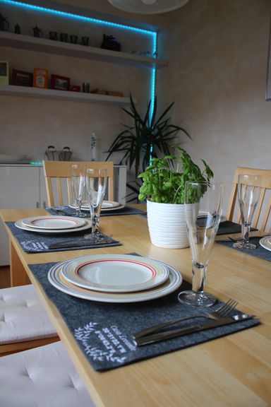 Der Essbereich ist mit allem ausgestattet, was das Herz begehrt. Der Tisch bietet Platz für bis zu 6 Personen, mit einem schönen Ausblick über die Gärten von Niederdielfen.